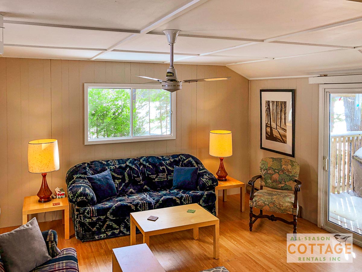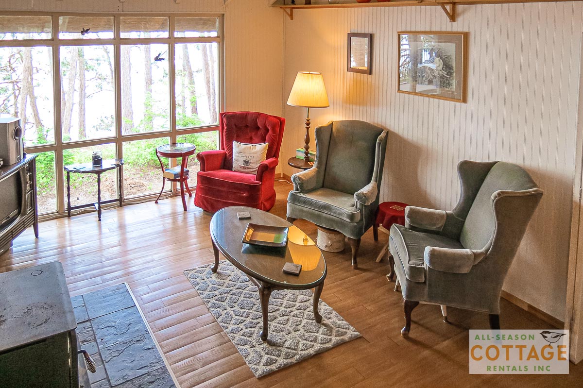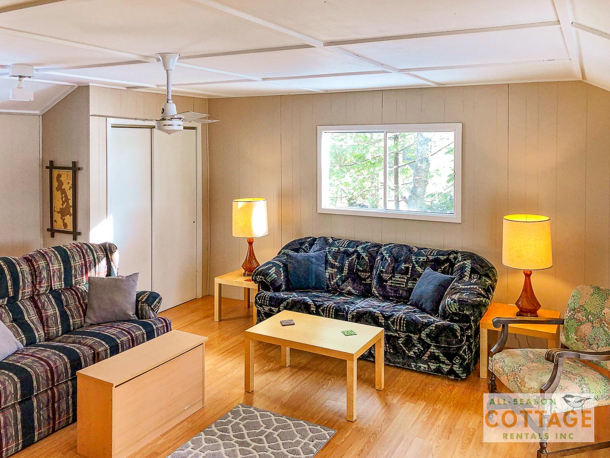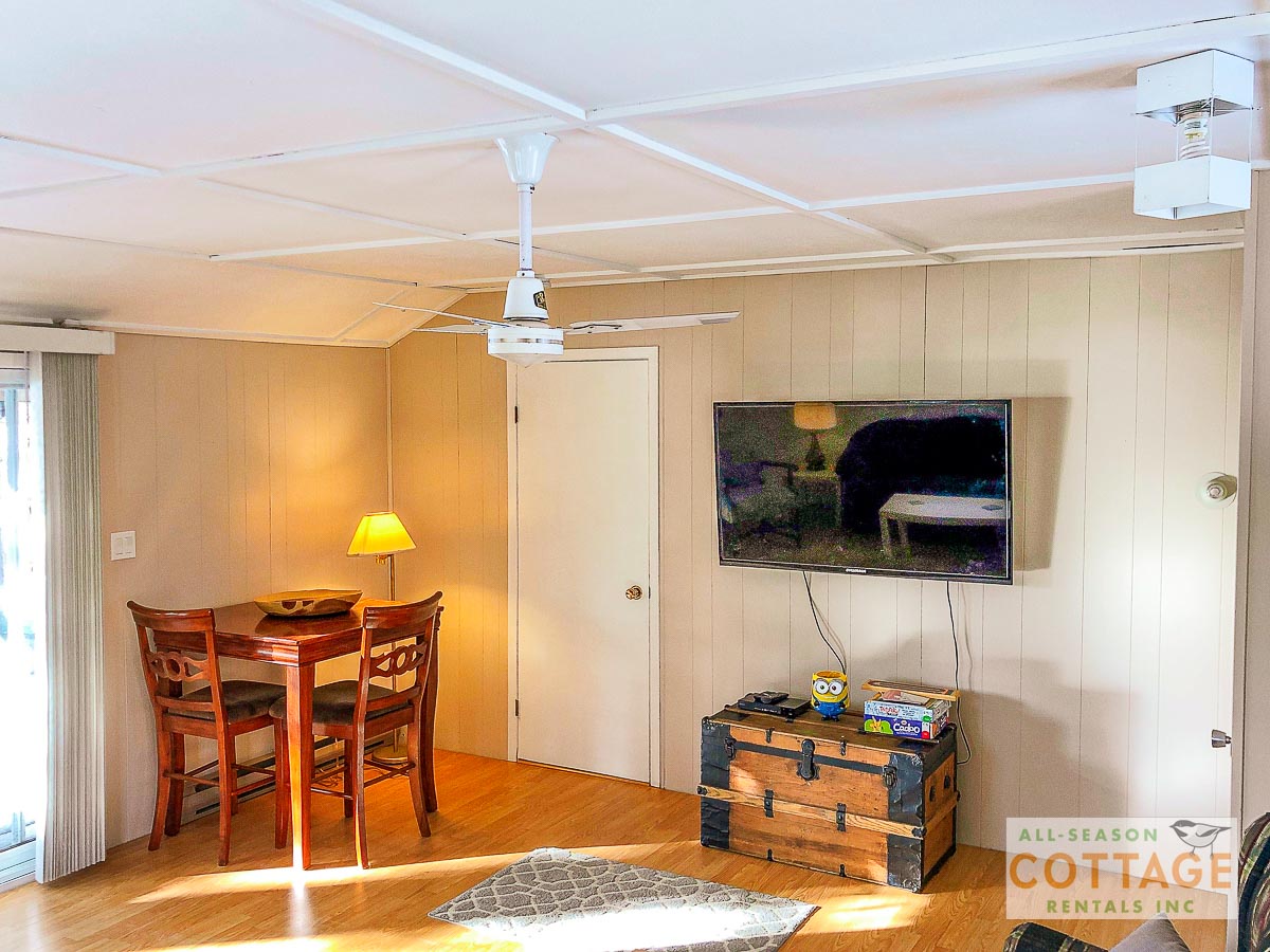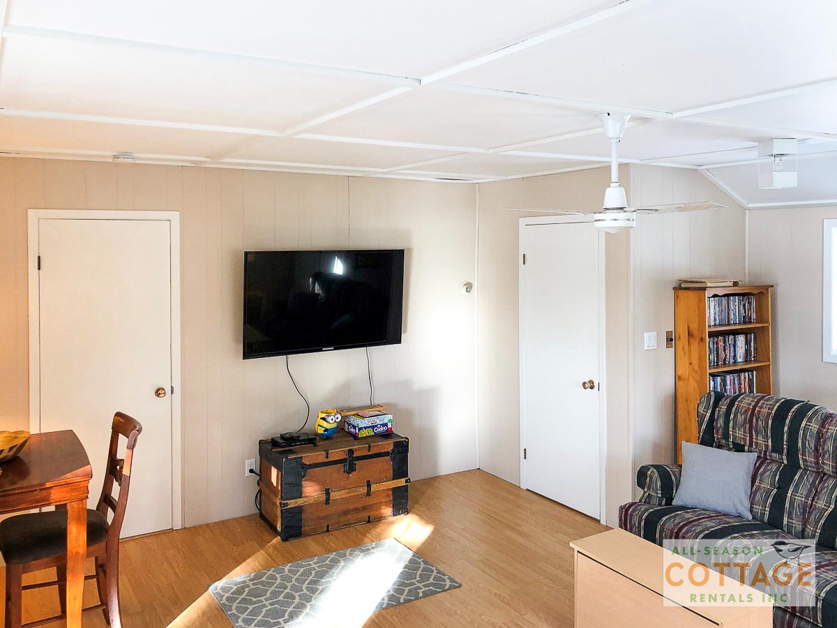 Lovely small cottage with everything needed for a relaxing vacation. Plenty of places to sit, both in and out of the sun, to chat or read or enjoy the view, including the hot tub which was great for the chilly mornings we had. We also canoed around the top of the lake to view everyone else’s cottages. Inside, the two sitting areas gave us lots of space to spread out and I enjoyed doing my online Pilates using the big screen tv.