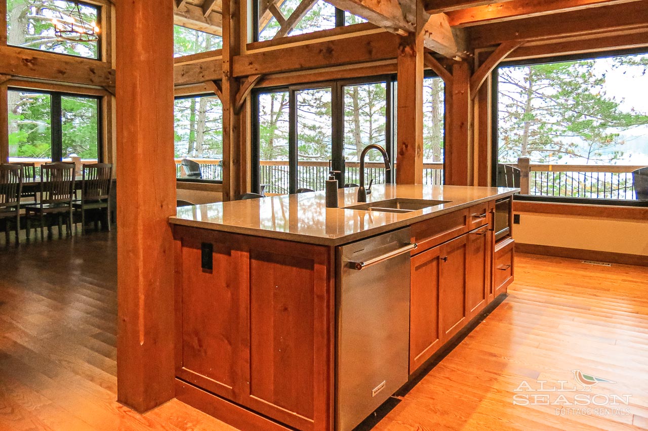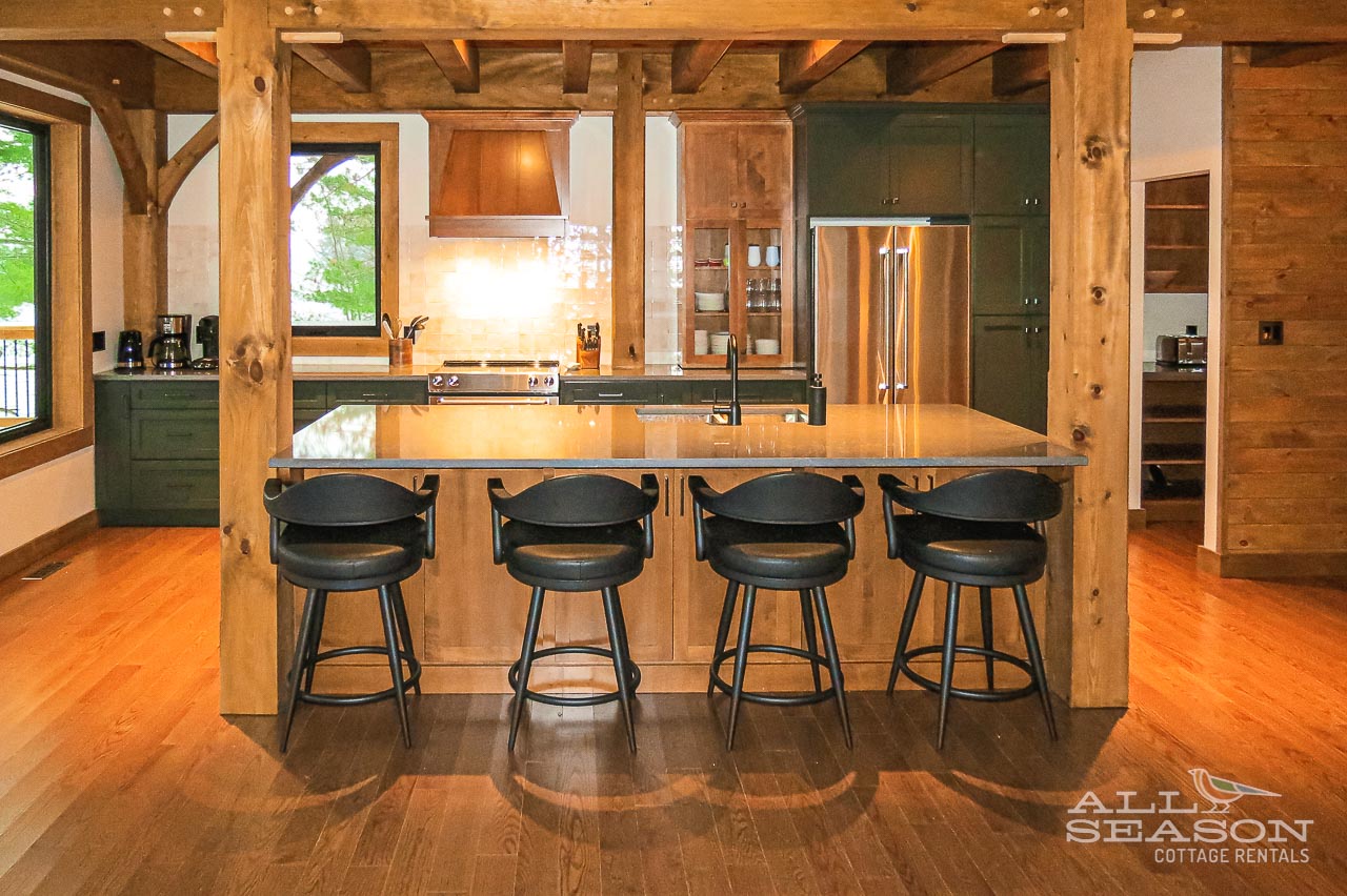 Your spacious gourmet kitchen features modern appliances and stunning lake views, perfect for creating memorable meals during your getaway.