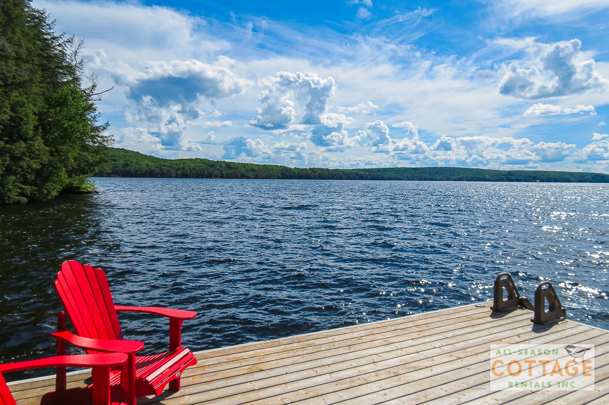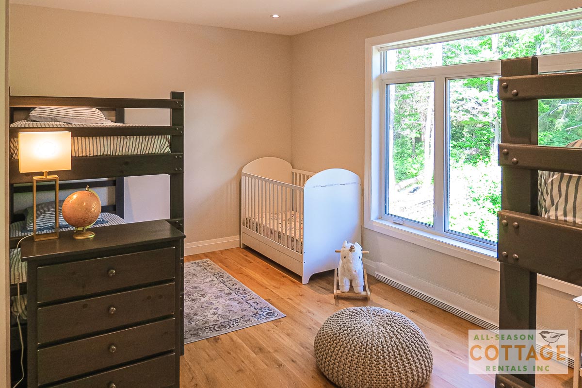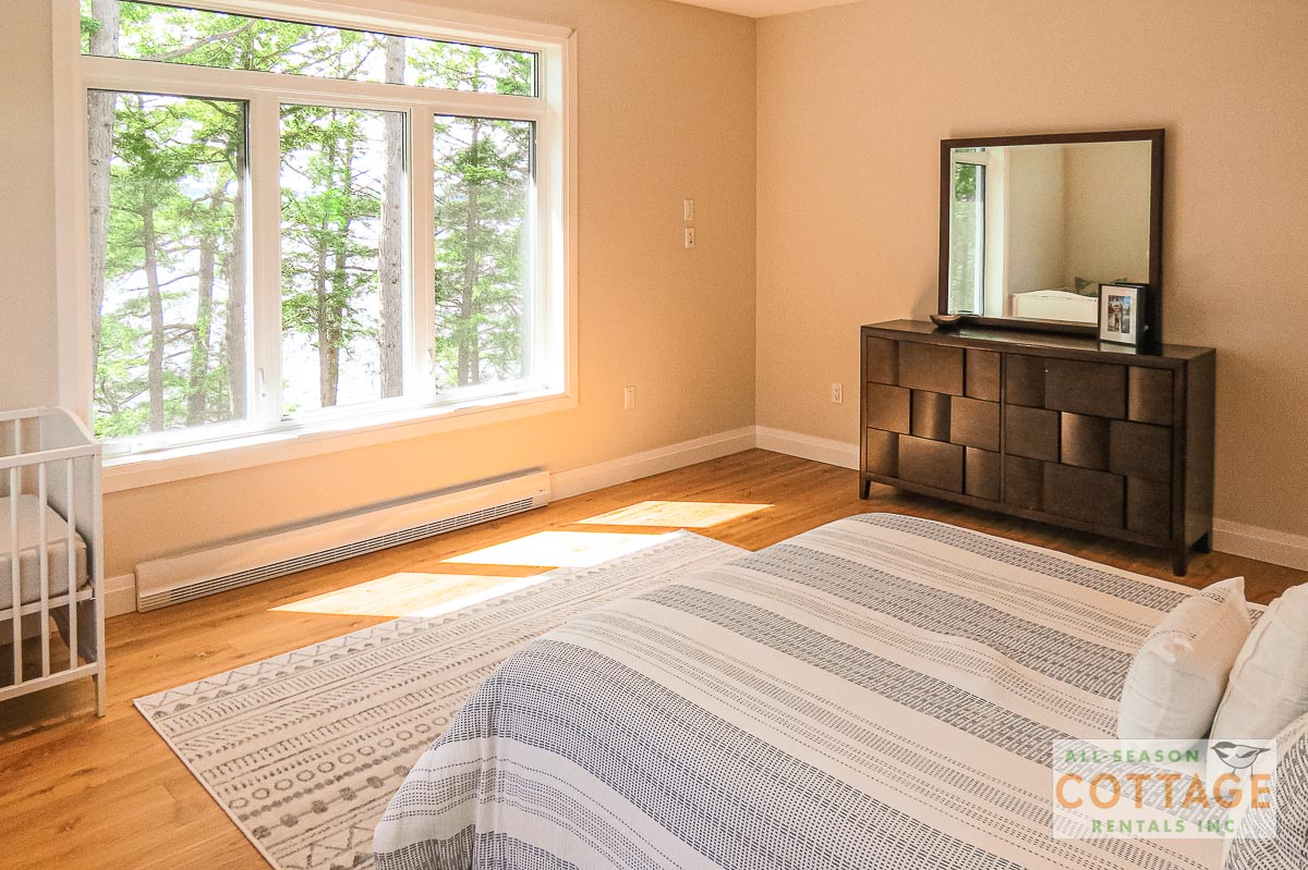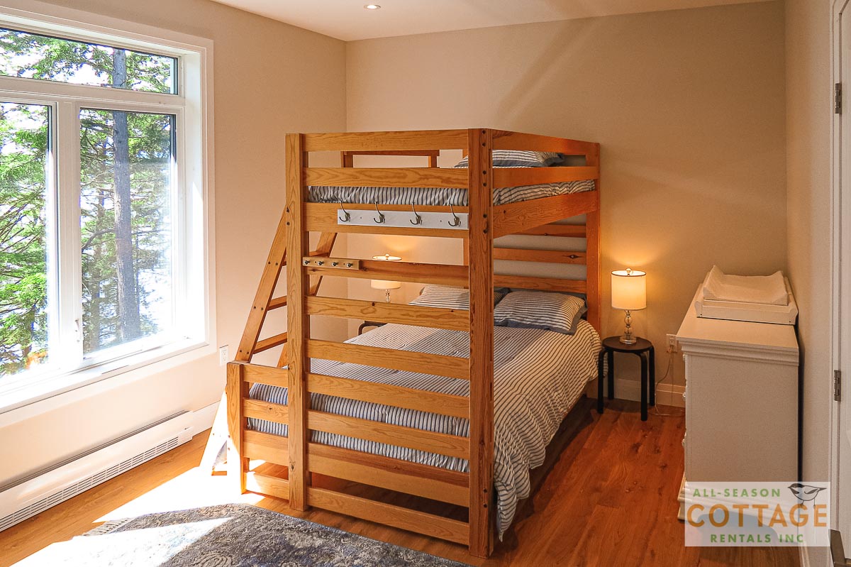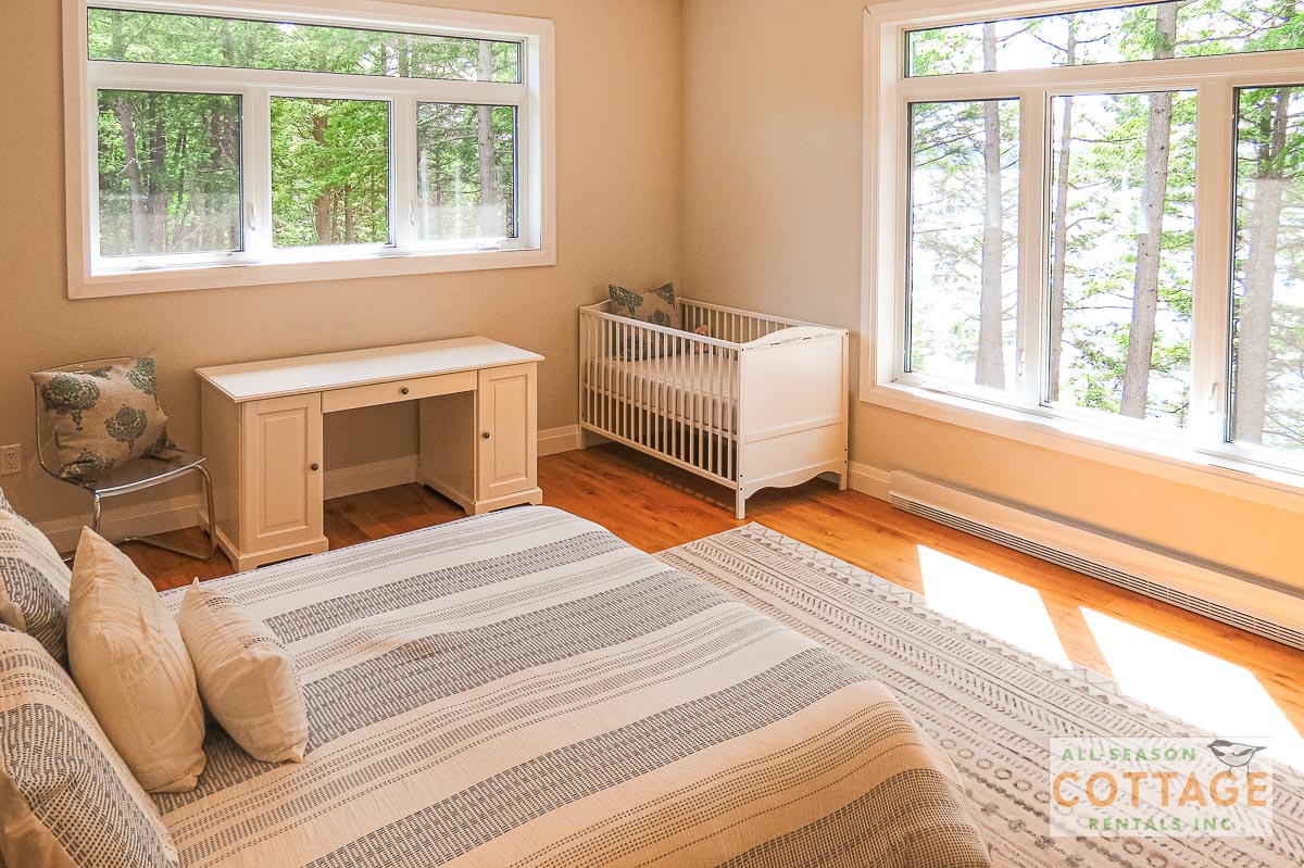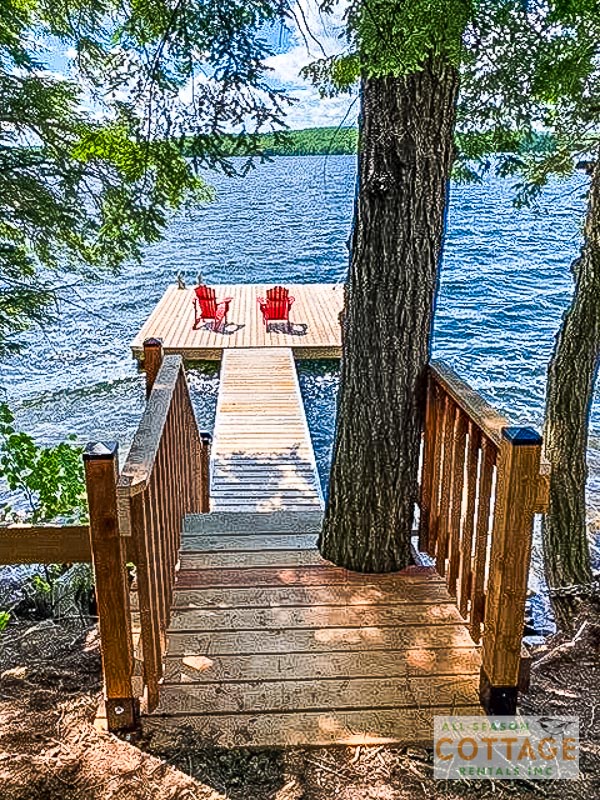 If you are looking for the ideal family cottage, look no further! This gorgeous 4-bedroom, 3-washroom cottage is set up perfectly for multi-generation families with young children. Two bedrooms are equipped with cribs. Other extras such as change table, baby bath, potty, high chair and kitchen stool are provided. There are also baby gates at the top and bottom of stairs. The cottage features an incredibly well stocked, open concept kitchen, dining and living room area. One bedroom is on the main floor and the other three are upstairs. Attached to the master bedroom is a large 5PC washroom with steam shower! Off the end of the cottage is a large sunroom, leading out to patio with BBQ and picnic table. Unlimited internet access is available, as well as satellite TV (with sports package) so you don't miss any games while up at the cottage. The large lawn outside is perfect for yard games. It is important to note that you have to walk down a relatively steep path from cottage to the lake, however, a rope handrail has been installed to ensure this can be done safely. Down at the water you will find a large dock with excellent deep water swimming (the shoreline is rocky, so shallow entry is not possible). The cottage is situated on a large lot offering tons of privacy with Western exposure and 500' of frontage.