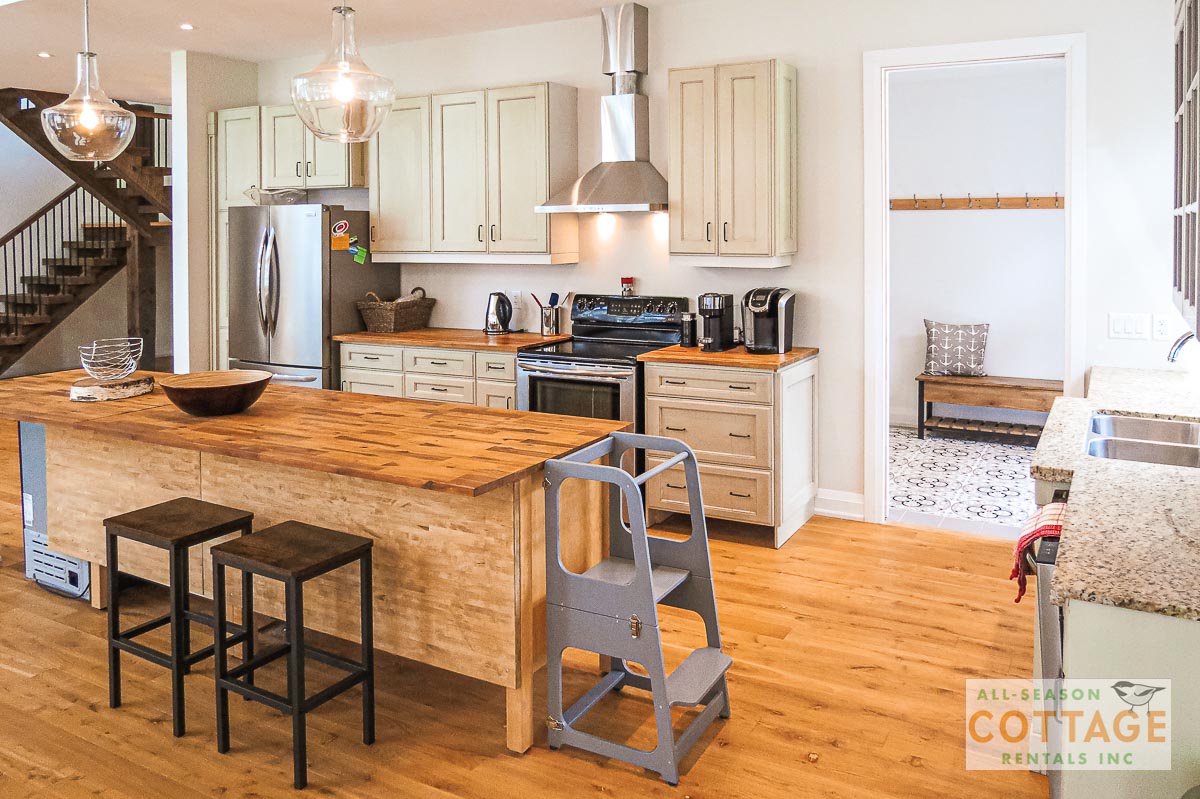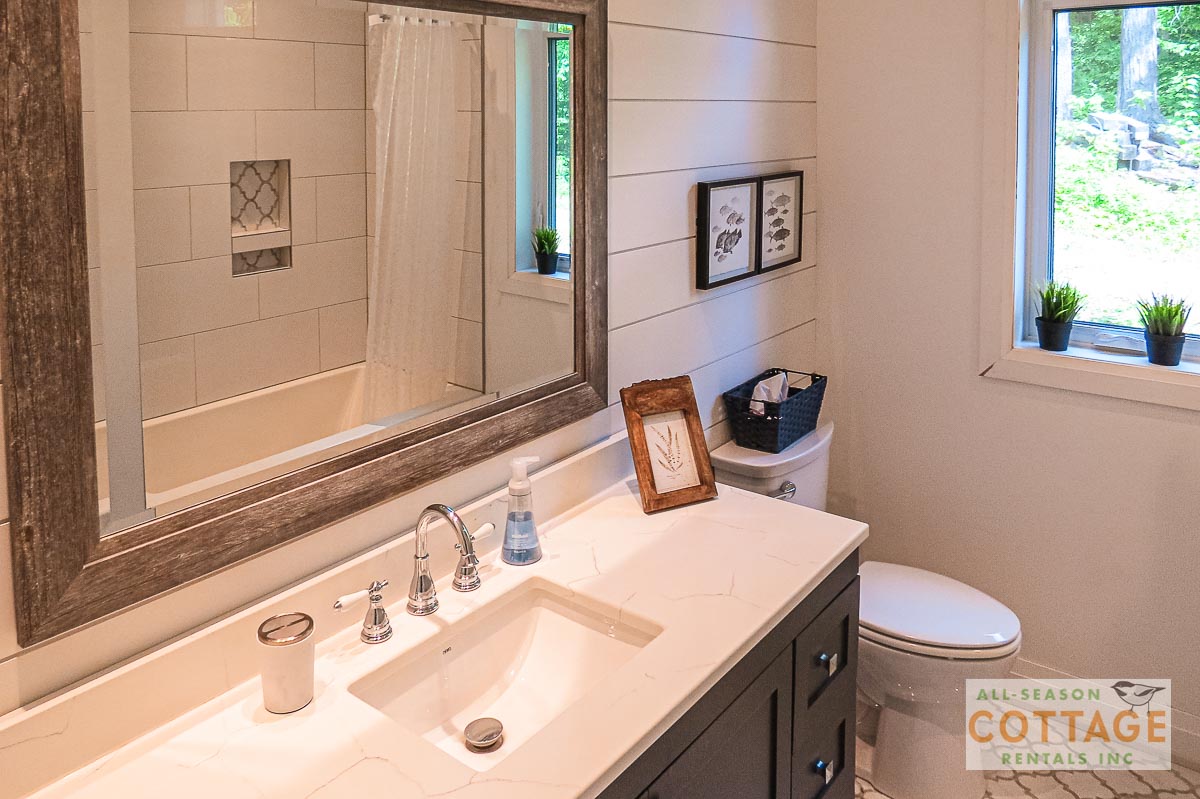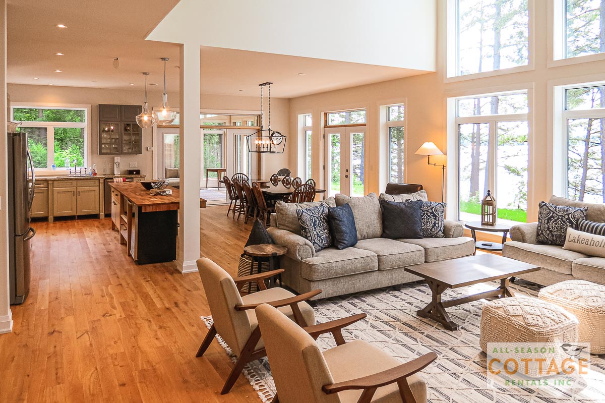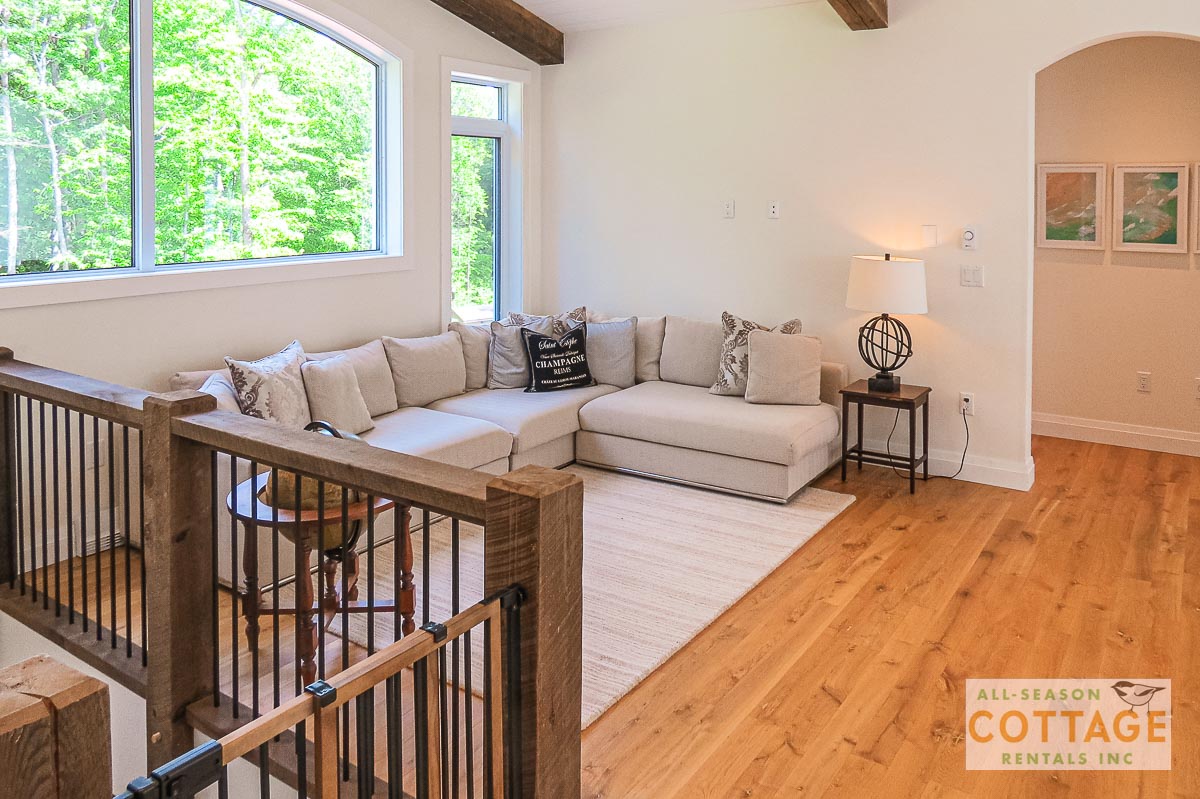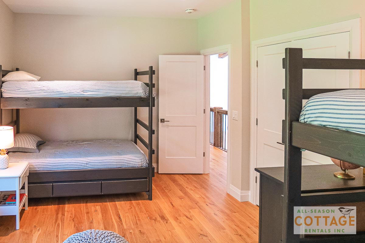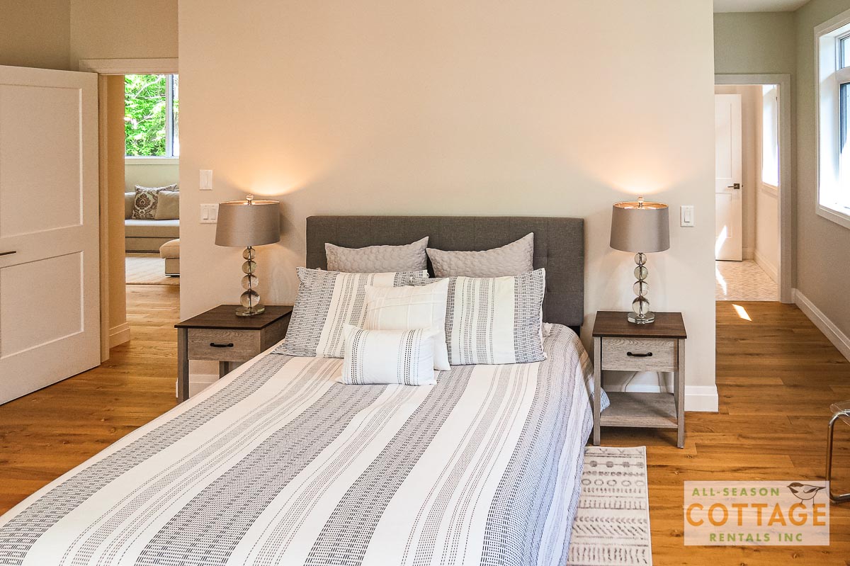 If you are looking for the ideal family cottage, look no further! This gorgeous 4-bedroom, 3-washroom cottage is set up perfectly for multi-generation families with young children. Two bedrooms are equipped with cribs. Other extras such as change table, baby bath, potty, high chair and kitchen stool are provided. There are also baby gates at the top and bottom of stairs. The cottage features an incredibly well stocked, open concept kitchen, dining and living room area. One bedroom is on the main floor and the other three are upstairs. Attached to the master bedroom is a large 5PC washroom with steam shower! Off the end of the cottage is a large sunroom, leading out to patio with BBQ and picnic table. Unlimited internet access is available, as well as satellite TV (with sports package) so you don't miss any games while up at the cottage. The large lawn outside is perfect for yard games. It is important to note that you have to walk down a relatively steep path from cottage to the lake, however, a rope handrail has been installed to ensure this can be done safely. Down at the water you will find a large dock with excellent deep water swimming (the shoreline is rocky, so shallow entry is not possible). The cottage is situated on a large lot offering tons of privacy with Western exposure and 500' of frontage.